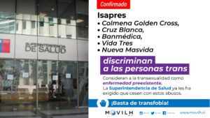 Tras una investigación, la Superintendencia de Salud informó al Movimiento de Integración y Liberación Homosexual (Movilh) que al menos 5 isapres discriminan a las personas en razón de su identidad de género, llegando al extremo de considerar a la transexualidad como una enfermedad preexistente y de rebajar la coberturas de sus planes.