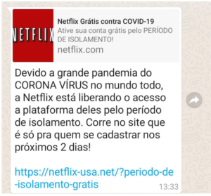 Kaspersky también detectó una estafa que se ha propagado por las redes sociales y distintos servicios de mensajería, con una alerta indicando que Netflixofrecerá streaminggratuitohasta el final de la pandemia de COVID-19. El mensaje contiene un enlace que dirige a una página que pide responder algunas preguntas y luego compartirla con 10 contactos más. El objetivo de la estafa es dirigir el tráfico a un sitio web que factura con anuncios.