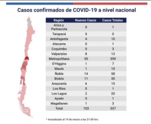 El ministro de Salud, Jaime Mañalich, tras la reunión en La Moneda que todos los días encabeza el presidente Sebastián Piñera, señaló que son 103 los casos nuevos confirmados de Covid-19, llegando a 537 la cifra de contagiados en Chile, la mayor parte de ellos en la Región Metropolitana.