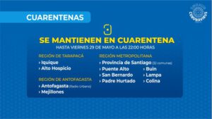 Las 32 comunas de el gran Santiago, más Puente Alto, San Bernardo, Padre Hurtado, Buin, Lampa y Colina, seguirá en cuarentena, por ahora, hasta el 29 de mayo.