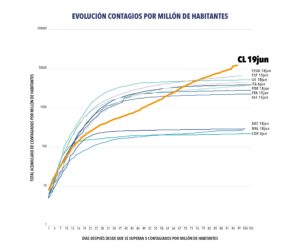 Respecto de la movilidad relativamente alta observada en el gran Santiago, en el informe del lunes 22 de junio entregaremos un adelanto de los resultados de una muy esclarecedora encuesta realizada por Ipsos y Espacio Público. Creemos que será de ayuda para orientar el esfuerzo público en la tarea de reducir los viajes dentro de la ciudad a niveles que se traduzcan en una contracción consistente de los contagios.