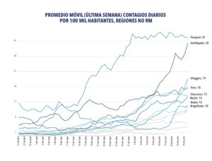 Si bien Tarapacá es la región que muestra todavía la mayor cantidad de contagios diarios por 100 mil habitantes, la situación en varias otras regiones se ha vuelto complicada.