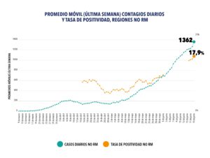 La cifra de nuevos contagios para todas las regiones (no RM) alcanzó 1.869 hoy, y el promedio móvil de la última semana asciende a 1362, por lejos las cifras más altas en lo que va de la epidemia (Figura 1c). El promedio diario de la última semana es 24 % mayor que el de la semana anterior.