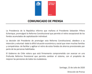 La Presidencia de la República informó a través de un comunicado que mañana viernes 24 de julio, el Presidente de la República, Sebastián Piñera promulgará la Reforma Constitucional que permite el retiro excepcional de los fondos acumulados de capitalización individual que fue aprobada esta mañana en el Congreso.