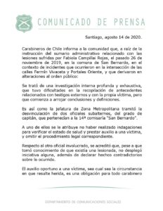 Dos capitanes de la 14 Comisaría de San Bernardo fueron dados de baja hoy de la institución por no haber prestado auxilio a Fabiola Campillay, madre de 36 años que perdió la vista durante el estallido social, luego que fuera impactada en la cara por un cartucho de gas lacrimógeno de la policía uniformada.