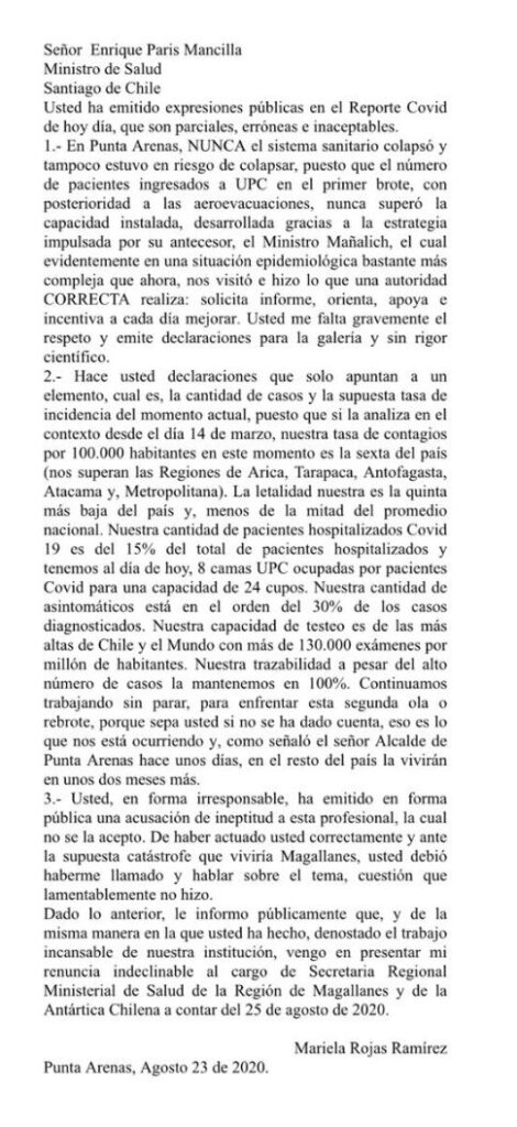 «Las expresiones públicas en el último balance nacional son parciales, erróneas e inaceptables», sostuvo la funcionaria a través de una carta. Además, aclaró que «el sistema sanitario de la ciudad de Punta Arenas nunca colapsó».