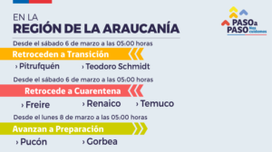 Por su parte, Pitrufquen y Teodoro Schmidt, lo harán a Transición, con lo cual sus habitantes no podrán salir los sábados y domingos, salvo con permiso de Comisaría Virtual.
