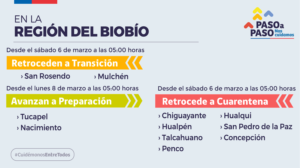 En BíoBío, también retroceden, pero a Transición las comunas de San Rosendo y Mulchén. Mientras tanto, Tucapel y Nacimiento avanzarán a Preparación el próximo lunes a las 5 de la madrugada.