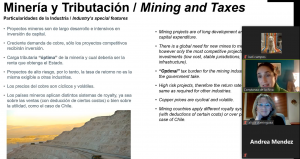 Posteriormente, la socia tributaria de EY, Alicia Domínguez, comentó que las dificultades para discutir sobre esta materia radican en el hecho de que los minerales son un recurso no renovable y estratégico para los países que poseen yacimientos. A la vez, por efectos de la industria minera, se generan encadenamientos productivos con diversos sectores económicos, lo cual añade un factor a considerar.
