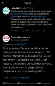 «La Red propuso a la agencia externa de medios Initiative una bonificación con costo cero para aparecer con publicidad de Carozzi en la pauta del programa ‘La Batalla de Chile'», ante lo cual «dicha agencia externa no respetó los lineamientos previamente establecidos respecto de no involucrarnos en programas de contenido político de ningún tipo y aceptó por error la bonificación», explicó la empresa.