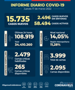 El Ministerio de Salud informa 15.735 casos nuevos de COVID-19, con una positividad de 14,05% en las últimas 24 horas a nivel nacional, con 108.919 exámenes, PCR y test de antígeno. La positividad diaria en la Región Metropolitana es de 11,28%.