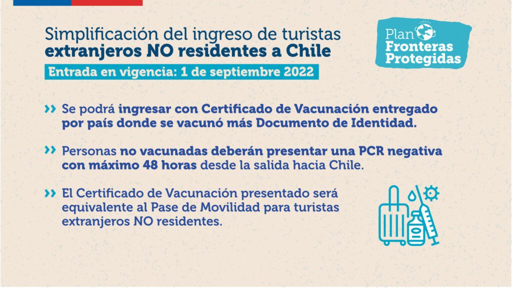 Los turistas podrán entrar a Chile, estén o no inoculados contra el Sars Cov II, con un certificado de vacunación del país de origen o presentando un PCR negativo tomado como máximo 48 horas antes de la salida hacia Chile.