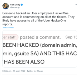 El investigador Sam Curry habría intercambiado mensajes con quien asegura ser el responsable del ataque. Éste le envió capturas para demostrar que habría logrado acceso completo a una parte importante y crítica de la infraestructura tecnológica de Uber, como son: acceso a cuentas de administrador, a los servidores de Amazon Web Service, el panel de HackerOne con el reporte de las vulnerabilidades, el canal de Slack, acceso a cuentas de administrador de vSphere y de Google Suite. Según Curry, parece que se trata de un compromiso total de sus sistemas.
