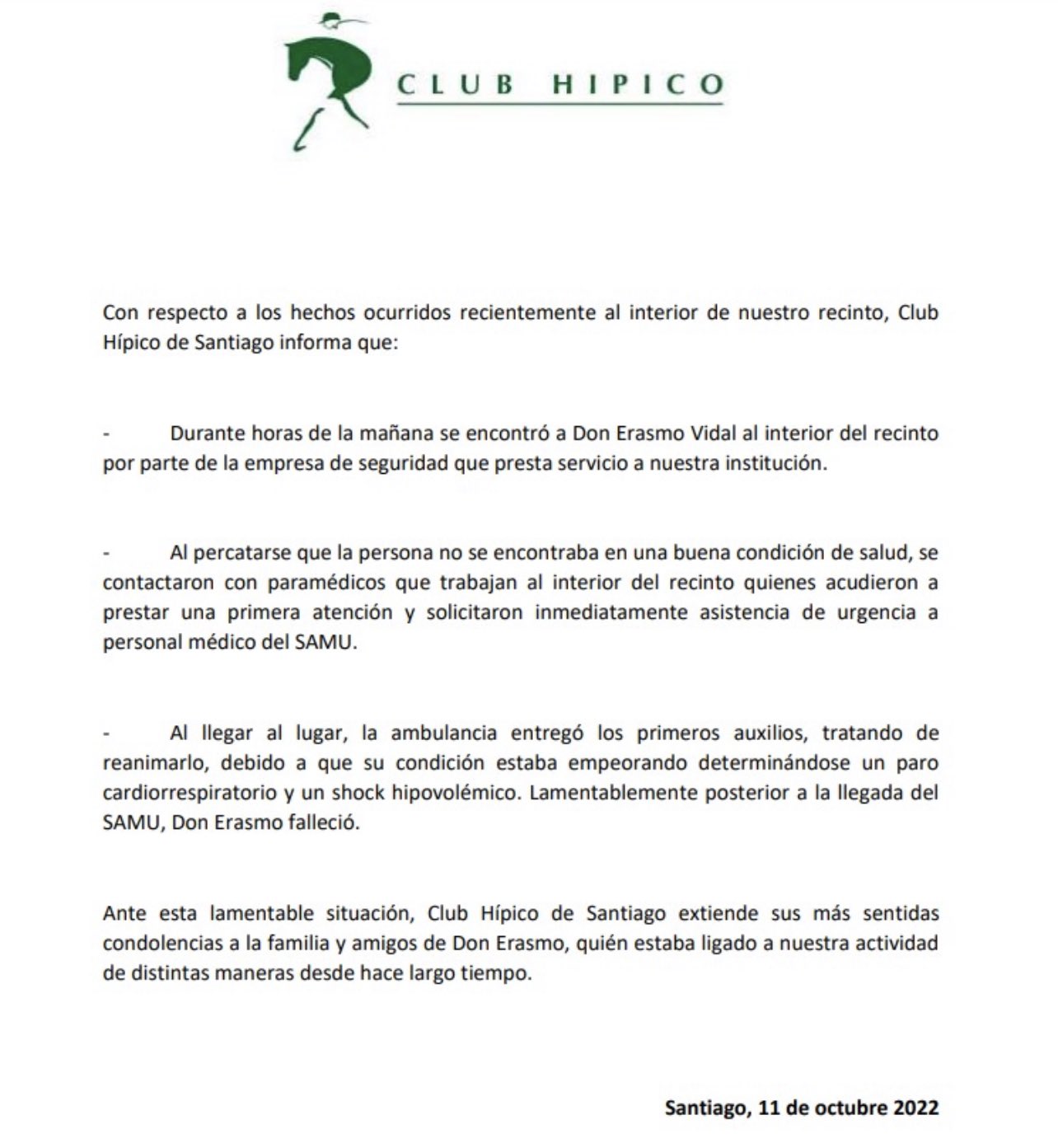 El Club Hípico confirmó esta mañana la muerte de Erasmo Vidal, padre del futbolista Arturo Vidal, por un paro cardiorrespiratorio y un shock hipovolémico.