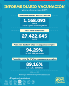 El Ministerio de Salud informa que, con fecha de corte de ayer jueves 5 de enero, según los datos del Departamento de Estadística en Información de Salud (DEIS), se han administrado 1.168.093 dosis de Vacuna Anual COVID-19, correspondiente al 20,38% de cobertura de la población objetivo estimada en 5.732.092 personas.