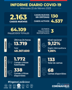 El reporte de este miércoles 22 de febrero registró 2.163 casos nuevos de COVID-19, con una positividad de 9,12% en las últimas 24 horas a nivel nacional, con 13.719 exámenes, PCR y test de antígeno. La positividad diaria en la Región Metropolitana es de 7,86%.