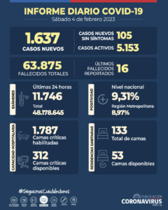 El reporte de casos de este sábado 4 de febrero registra 1.637 casos nuevos de COVID-19, con una positividad de 9,31% en las últimas 24 horas a nivel nacional, con 11.746 exámenes, PCR y test de antígeno. La positividad diaria en la Región Metropolitana es de 8,97%.