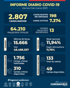 El reporte de este viernes 3 de marzo registró 2.807 nuevos casos de COVID-19, con una positividad de 11,94% en las últimas 24 horas a nivel nacional, con 15.666 exámenes, PCR y test de antígeno. La positividad diaria en la Región Metropolitana es de 11,75%.