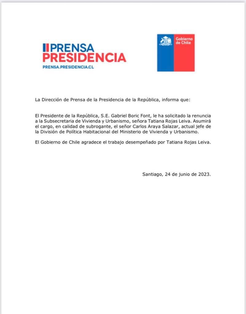 La subsecretaria de Vivienda y Urbanismo y militante de Revolución Democrática, Tatiana Rojas, renunció hoy a su cargo, luego que el presidente Boric le pidiera que diera un paso al costado.