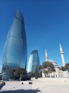 El Casco Antiguo de Bakú, con sus murallas medievales, ha sido declarado Patrimonio de la Humanidad por la UNESCO, y nuevos proyectos arquitectónicos, como las Flame Towers, reflejan la fusión de tradición y modernidad.