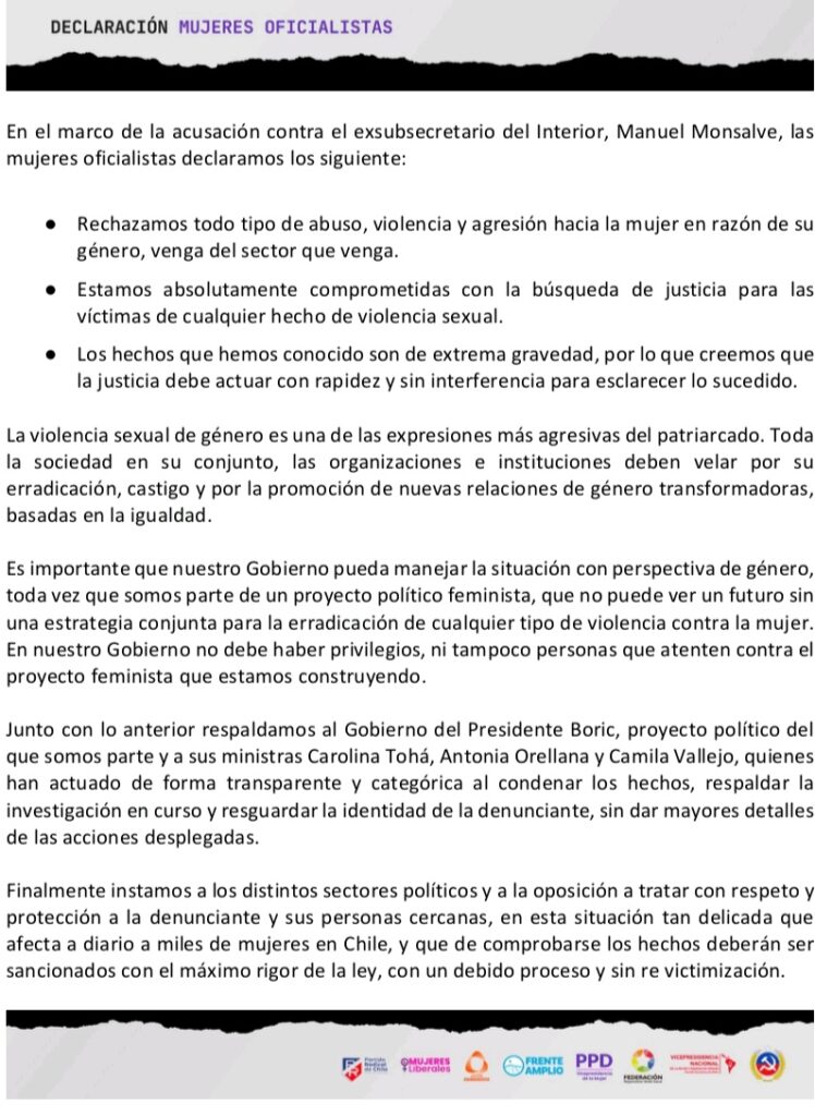 En medio de la polémica acusación contra el exsubsecretario del Interior, Manuel Monsalve, un grupo de mujeres oficialistas emitió una declaración pública en la que rechazan cualquier forma de abuso, violencia o agresión hacia las mujeres, independientemente de su origen político, y reafirman su compromiso con la justicia para las víctimas de violencia sexual.
