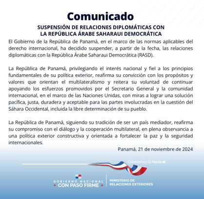 Reflejando un ajuste estratégico de su política exterior, la República de Panamá anunció, a través de un Comunicado oficial emitido por su Ministerio de Asuntos Exteriores, la suspensión de sus relaciones diplomáticas con la denominada «República Árabe Saharaui Democrática».