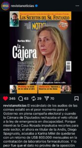En los audios, Spagnuolo afirma haber hablado directamente con el presidente: “Están choreando, te podés hacer el boludo, pero no me tiren a mí este fardo. Tengo todos los WhatsApps de Karina, olvidate”. Más adelante sostiene que Karina Milei y Martín Menem “se llevan de medio palo para arriba por mes en medicamentos”, asegurando tener pruebas de que la hermana del mandatario recibía “el 3 por ciento”.