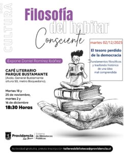 El próximo martes 2 de diciembre, a las 18:30 horas, el filósofo y columnista de El Periodista Daniel Ramírez Ibáñez encabezará en el Café Literario Parque Bustamante la charla “El tesoro perdido de la democracia: Fundamentos filosóficos y trasfondo histórico de una idea mal comprendida”, instancia abierta al público y organizada por el Sistema de Bibliotecas Públicas de Providencia.
