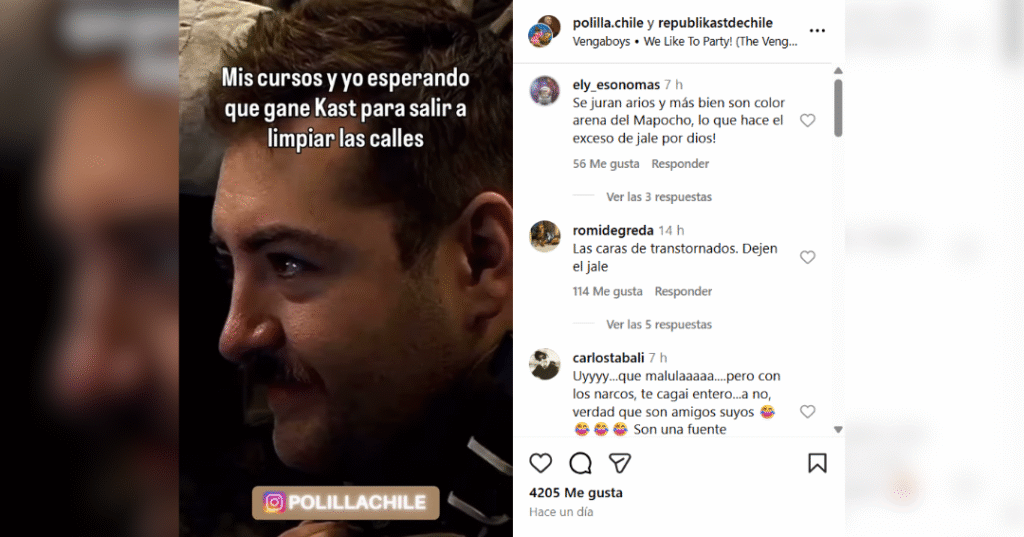 El republicano compartió la publicación de la cuenta de Instagram polilla.chile junto a republikastdechile, junto con la leyenda: “Mis cursos y yo esperando que gane Kast para salir a limpiar las calles”.