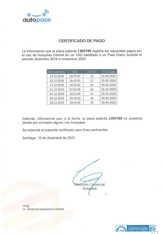 Finalmente, Jara compartió el comprobante del pago de la deuda, el cual indica que fueron siete los días que la candidata transitó sin TAG. El documento muestra que sucedió entre el 14 y el 28 de diciembre de 2019 y que el pago de las multas se realizó el 25 de enero de 2020.