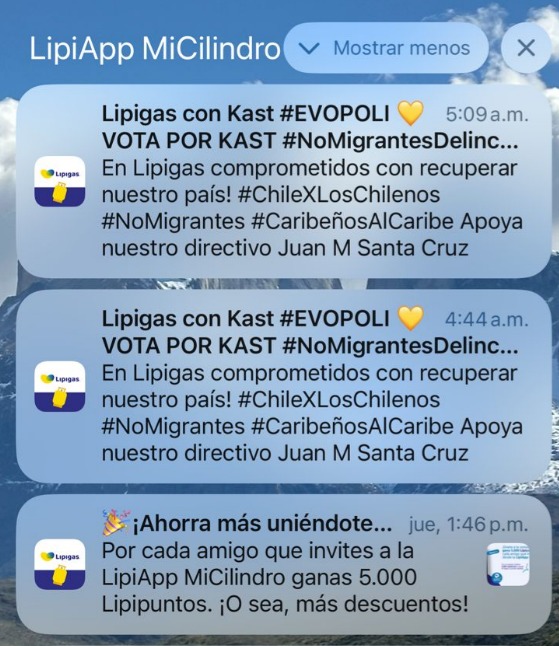 Según pudo constatar El Periodista, el mensaje es auténtico y fue recibido por las personas que tienen descargada la aplicación de LipiApp. En la notificación recibida por los usuarios durante la madrugada se lee: “Lipigas con Kast #EVOPOLI. VOTA POR KAST. En Lipigas comprometidos con recuperar nuestro país! #ChileXLosChilenos #NoMigrantes #CaribeñosAlCaribe”.