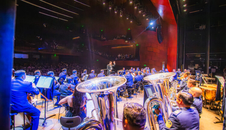 El concierto vespertino estuvo a cargo de la Banda Sinfónica de la Fuerza Aérea de Chile, dirigida por el maestro Fabrizzio De Negri, junto a más de 150 voces de coros regionales, en una propuesta monumental que destacó por su fuerza expresiva y dimensión colectiva.