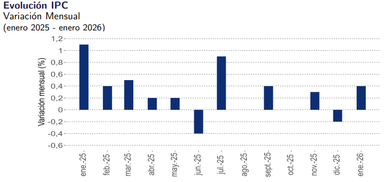 El Índice de Precios al Consumidor (IPC) registró en enero de 2026 una variación mensual de 0,4%, acumulando 0,4% en lo que va del año y 2,8% a doce meses, según informó esta mañana el Instituto Nacional de Estadísticas (INE). Con ello, la inflación anual cae por primera vez bajo el 3% en casi cinco años.