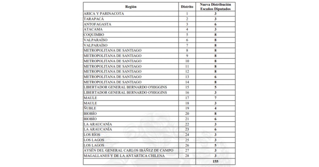 Entre los principales resultados de la nueva asignación, varios distritos concentran el máximo de 8 escaños, especialmente en la Región Metropolitana y en regiones como Valparaíso y Biobío. En contraste, regiones como Arica y Parinacota, Tarapacá, Atacama, Los Ríos, Aysén y Magallanes mantienen el mínimo de 3 representantes cada una .